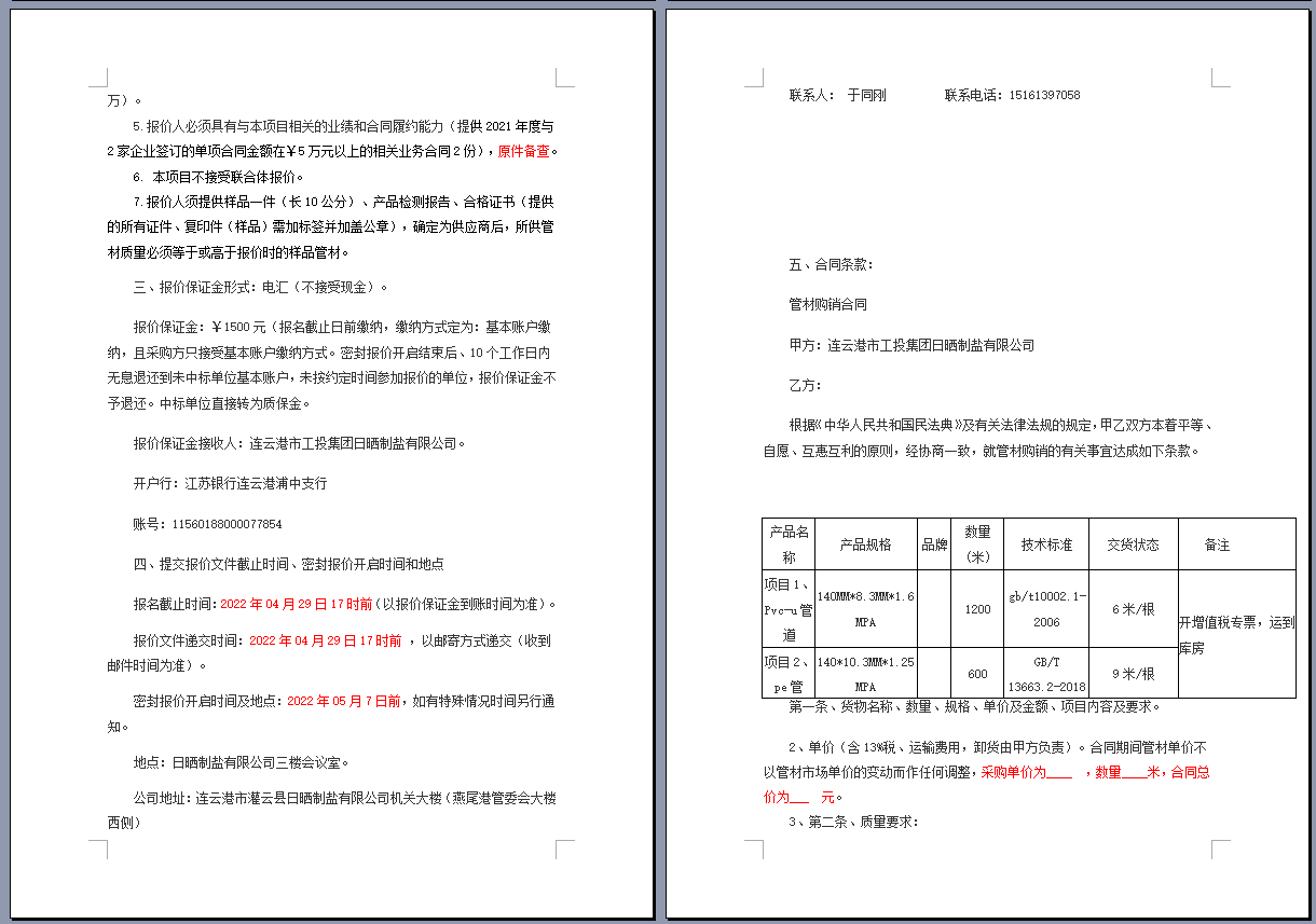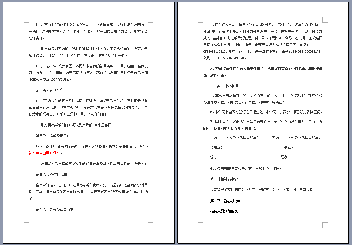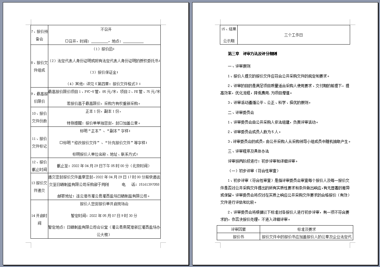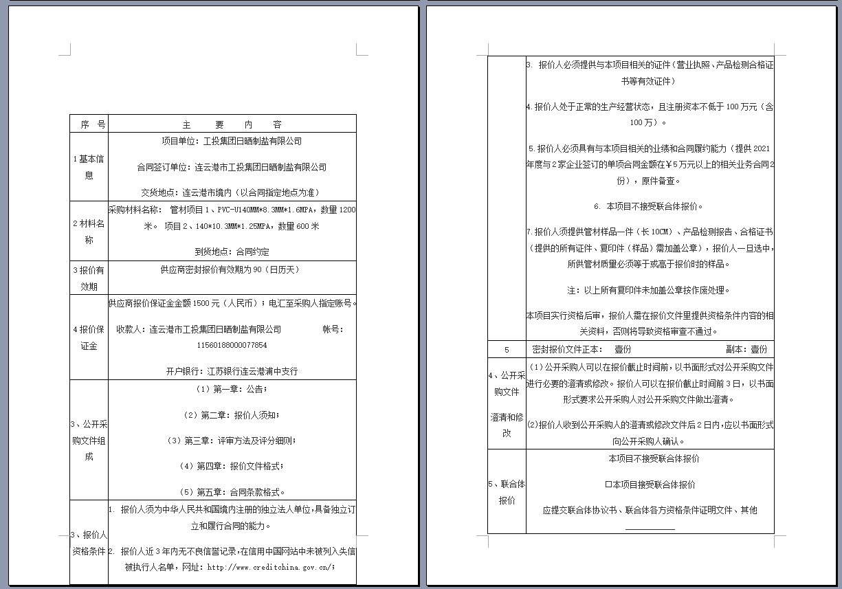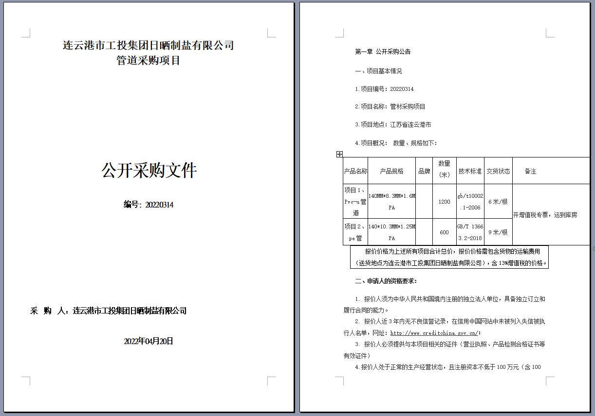 连云港市工投安博(中国)官方日晒制盐有限公司管道采购项目 公开采购文件