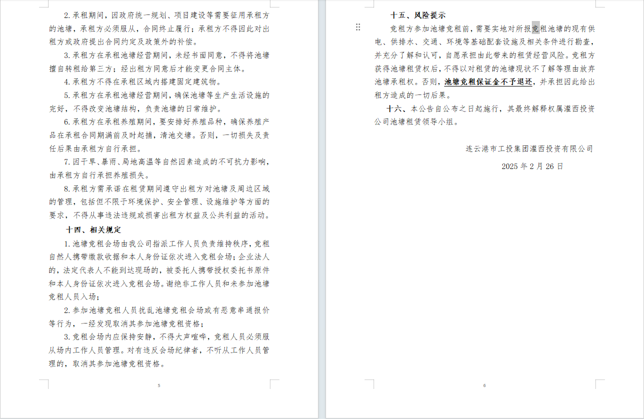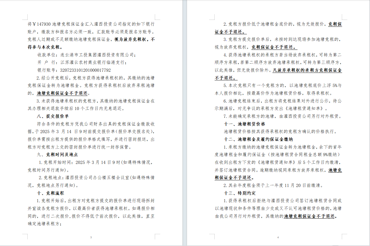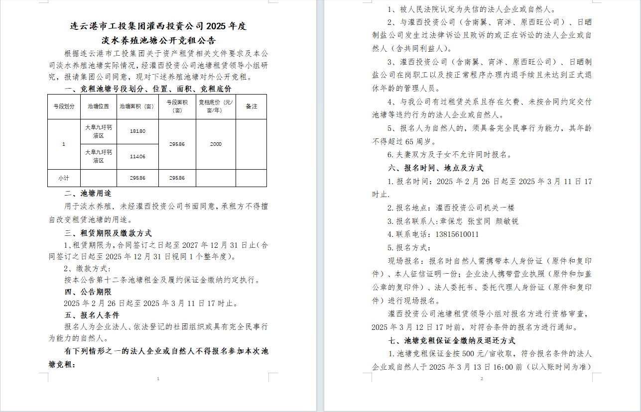 连云港市工投安博(中国)官方灌西投资公司2025年度淡水养殖池塘公开竞租公告