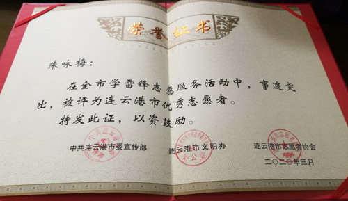 朱咏梅是来自江苏金桥制盐有限公司的普通员工,在连云港市志愿者协会的统一安排下,每天到连云港市高铁站测温点配合医务人员为乘客检测体温,并协助医务人员对体温出现异常的乘客进行复查。每天的服务都到深夜零点,等到送走最后一位乘客才回家。