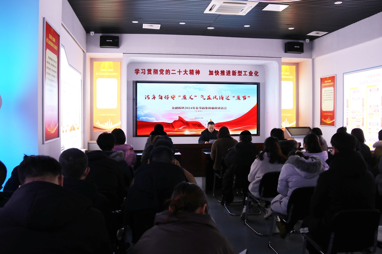 把“廉关”,过好迎新“廉洁年”。清心为治本,直道是身谋。金融板块从金融领域的特殊性出发,本着廉政谈话全覆盖的原则,紧盯春节节点、紧盯常见“节日病”,要求党员干部以上率下,严格要求自己、严格带好队伍,守好责任田,管好身边人,做到过节不忘警惕,过节不忘纪律,过节不忘尽责,严格执行中央八项规定,时刻保持自省、自警、自律、自励,清廉过节,坚决杜绝“节日腐败”。