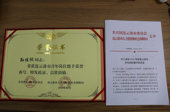 格斯达担保公司业务一部副经理、赣榆分部副经理孙佳忙同志,荣获2018年度连云港市“青年岗位能手”荣誉称号。