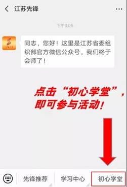 | 各单位党群工作部: 为引导广大党员干部认真学习《习近平谈治国理政》第三卷,推动党的科学理论“飞入寻常百姓家”,“江苏先锋”公众号特开辟“初心学堂”小程序,请组织本单位党员干部8月12日—10月30日登录“初心学堂”小程序一起听音频、读原著、悟原理!(请各位党员登陆后,单位名称统一填写为:安博网页版) 第一步:关注“江苏先锋”公众号