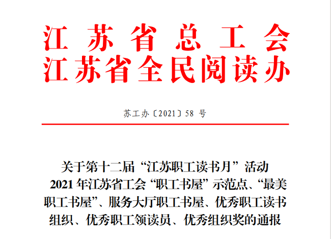 近日,江苏省总工会、江苏省全民阅读办联合下发《关于第十二届“江苏职工读书月”活动通报》(苏工办【2021】58号)文中,我公司职工书屋获评2021年度江苏省工会“职工书屋”示范点,同时获赠图书近200册。