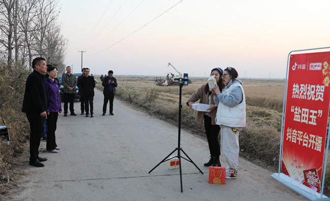 调研组先后参观“盐田玉”抖音带货直播间、“盐田玉”生产加工车间、大新农场水稻收割现场。