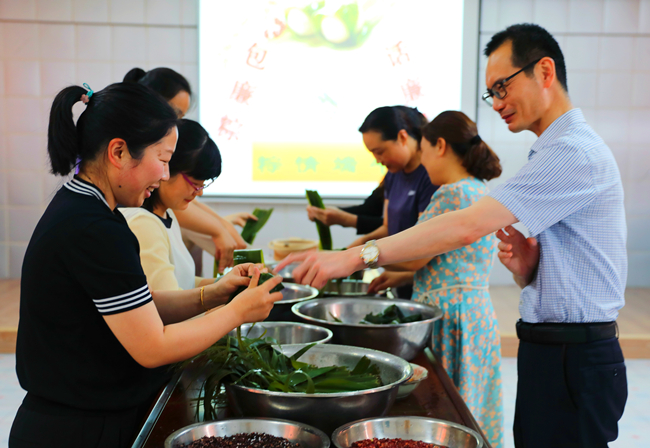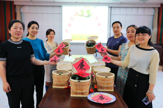 在活动现场,桌子上摆满了碧青粽叶、黑白糯米、红豆大枣、白色莲子,烘托出浓厚的节日气氛。大家欢聚一堂、欢声笑语,在传统文化中感受廉洁元素,一边聊着家常,一边包着粽子,先是选好“青”廉衣,然后放入提前泡好的 “莲”心馅,最后系紧“廉洁绳”,不一会,一个个碧绿飘香、形状各异“廉心粽”就包好了,被整齐地摆放在竹篮中。纪委书记朱文兵说:“廉心粽蕴含着清正廉洁的美好寓意,组织大家亲手包廉粽,是希望大家能够把‘廉’带回家,在品尝美味廉粽的同时,还要时刻绷紧廉洁弦,做到守廉洁、过廉节”。