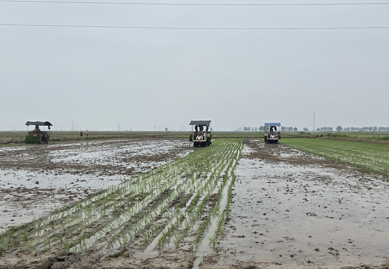 走进大新农场田间地头,伴随着机械轰鸣声,插秧机往来穿梭,一株株嫩绿的秧苗在插秧机苗盘上滑落,整齐地插入水田里。