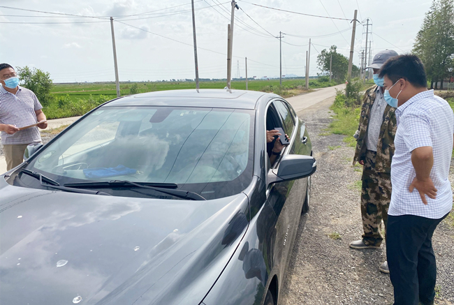 “请问你们是从哪里来?请戴好口罩,出示行程码、健康码。”大新农场党支部党员与部分职工一道,坚决当好疫情防控的“守门员”,在对外来车辆登记进入人员信息,检查健康码、行程码,开展疫情防护知识宣传。