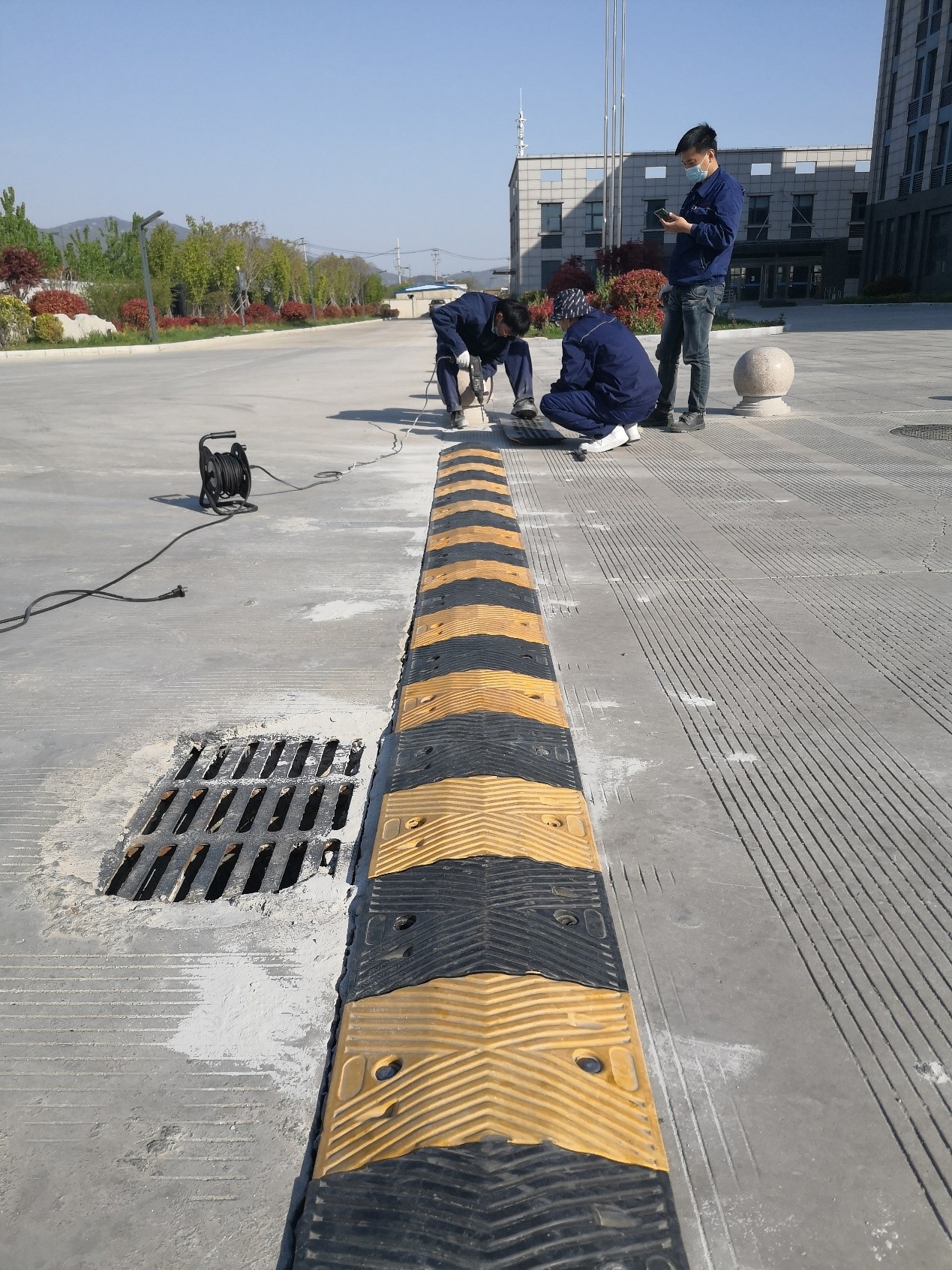 为了强化道路交通安全,公司在厂区主大门入口和停车场两处加设减速带。图为安全管理部员工在现场施工。