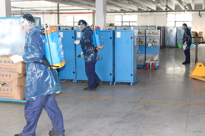 一时间各职能部门和有关人员迅速行动起来。办公室刘嫚嫚负责拨打120救护电话,并在厂门口迎接,处理接洽和后续工作。所有参与医疗协助和现场消杀人员领取并着装KN95防护口罩、防护服、护目镜、防护手套等,带好警戒线、消毒液和消毒工具。