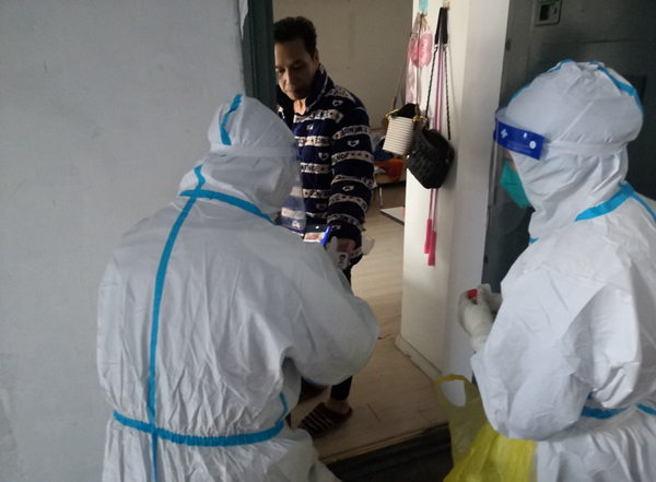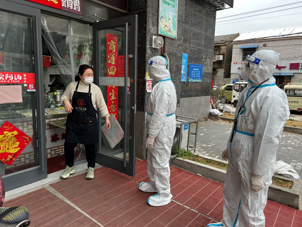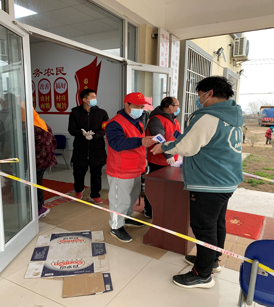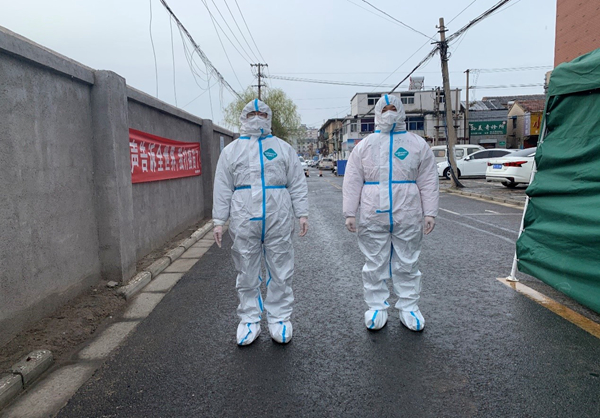 公司员工范益杨、李梦达是安博(中国)官方抗疫志愿队的队员。在冷冽寒风中,他俩身穿防护服挨家挨户通知商户暂停营业,同样的通知话语不厌其烦的重复着一遍又一遍,说得口干舌燥、疲惫不堪也未能阻拦他们继续前进的脚步。