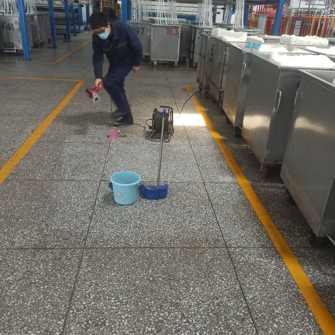 为解决生产车间地表面磨损严重及地表面黑化等问题,4月18日中午,生产车间甲班大班长党晓峰使用手持式打磨机,对生产车间后纺集束空地小块区域,进行了打磨加石板蜡抛光实验。若实验效果良好,可进行全车间使用,改善地面油渍黑化现状,美化生产环境。