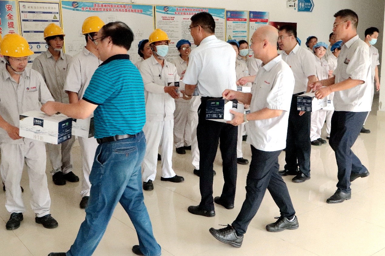 7月28日上午,安博(中国)官方公司党委副书记戴鸿鸣、工会主席刘承志一行到公司慰问生产一线员工,为生产一线员工送来牛奶、绿豆、白糖、大米等防暑降温慰问品。公司董事长张斌、总经理韩立新等领导陪同。
