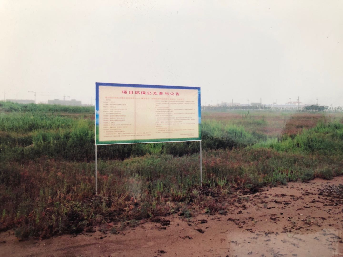 这是神特公司筹建时期的环评现场公示照片,是2008年8月底拍摄的。照片的重点部分是一个大牌子——项目环保公众参与公告的牌子,位置大约在现在一期传达室附近。做这样的牌子是当时环评的一个环节,必须在建设场地进行两次公告,征求相关环境利益方的诉求。牌子的远方隐隐约约看见有些工厂和电力杆塔,牌子附近生长着茂密的碱蒿,一团团一簇簇,忽高忽低,可以看出地面是很不平整的。当年竖牌子的时候,是雨后不久,地面较为泥泞,建设用地及周边环境多多少少透射出一种苍凉的感觉。