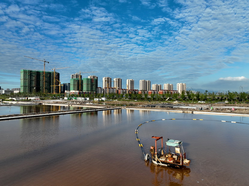 秋高气爽,这片百年的原盐生产基地进入了收获的旺季,一台收盐车在晒盐池中进行收盐作业。