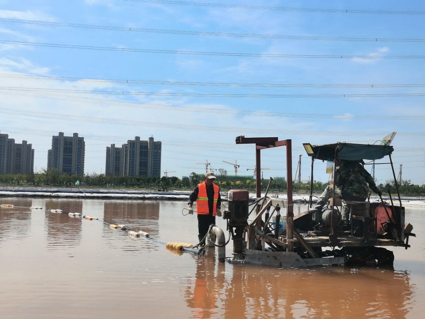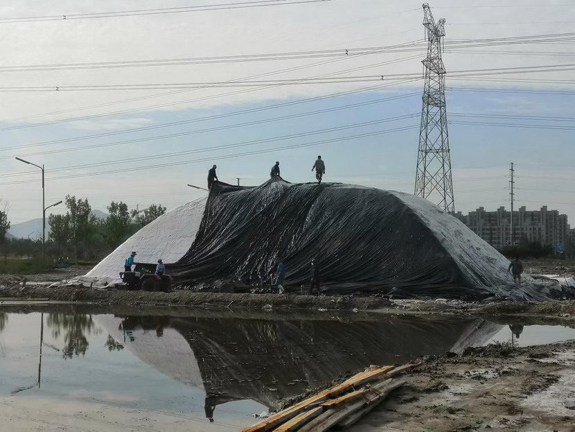 第一片180公亩的晒盐池已经收盐完毕,工人师傅们娴熟有序用塑布对盐廪进行覆盖,预防雨水造成盐斤淌化。