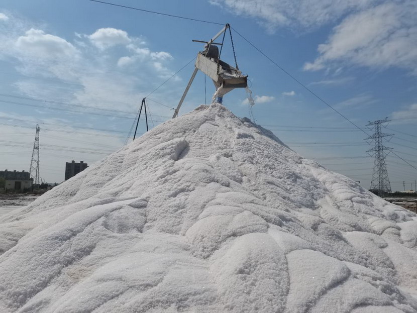远处,凌空飞架的高压电线下,白花花、明晃晃的盐廪,有如干净、洁白的雪山,景象十分美丽。