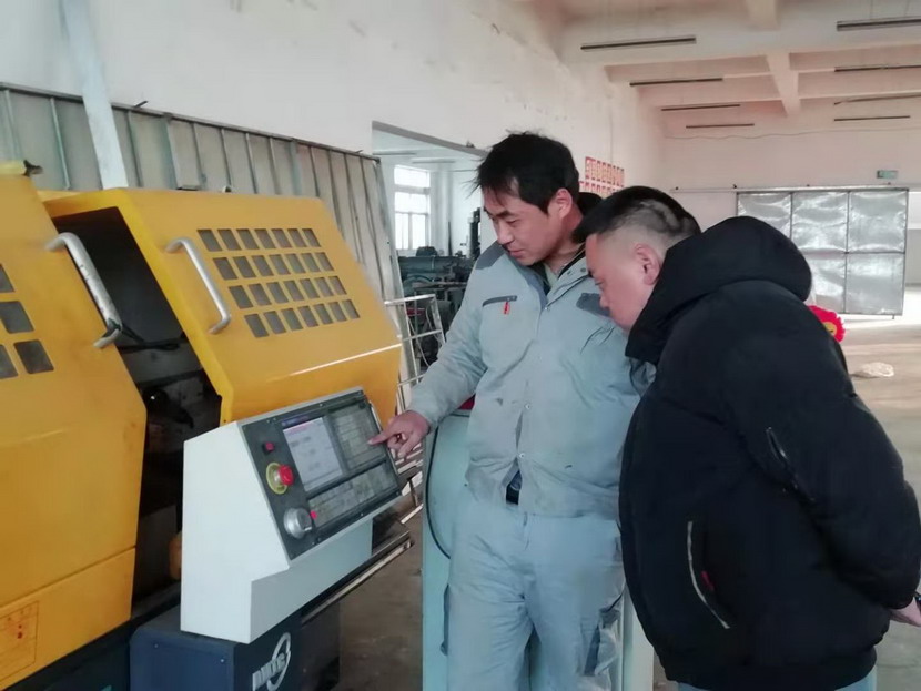 ▲2021年度星级员工-赵原尘(蓝衣)指导新员工操作数控机床