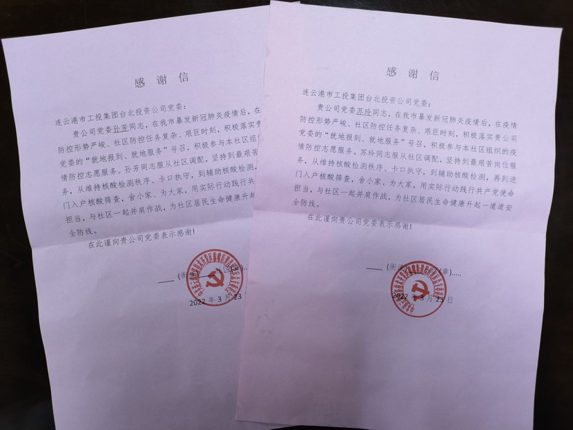 随后,公司又接连收到海州区新东街道外仓社区、幸福路街道西大岭社区通过邮寄、传真等方式送过来的疫情防控感谢信。