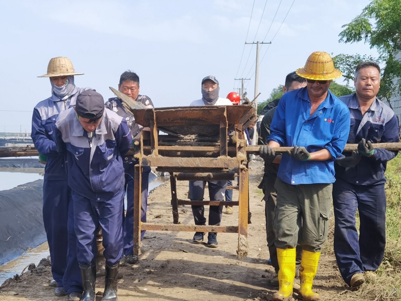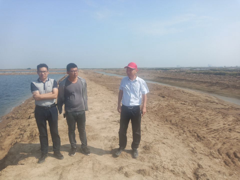 养殖池边,工作人员仔细的对河道清淤进行现场勘查,确保排水通畅。