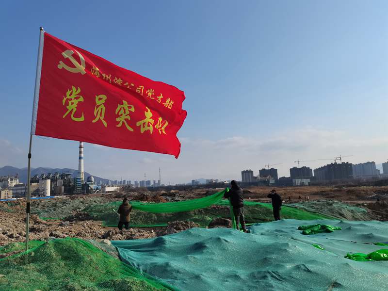 1月20日,在临达公司330亩货场的一处“山丘”上,一面鲜红的海州湾党支部“党员突击队”旗格外引人注目。当天中午12时,听闻兄弟单位临达公司急需人手苫盖防尘网,支部书记刘天义一声令下,海州湾“党员突击队”立即集结,穿戴好劳动装备,奔赴环境整治“主战场”。