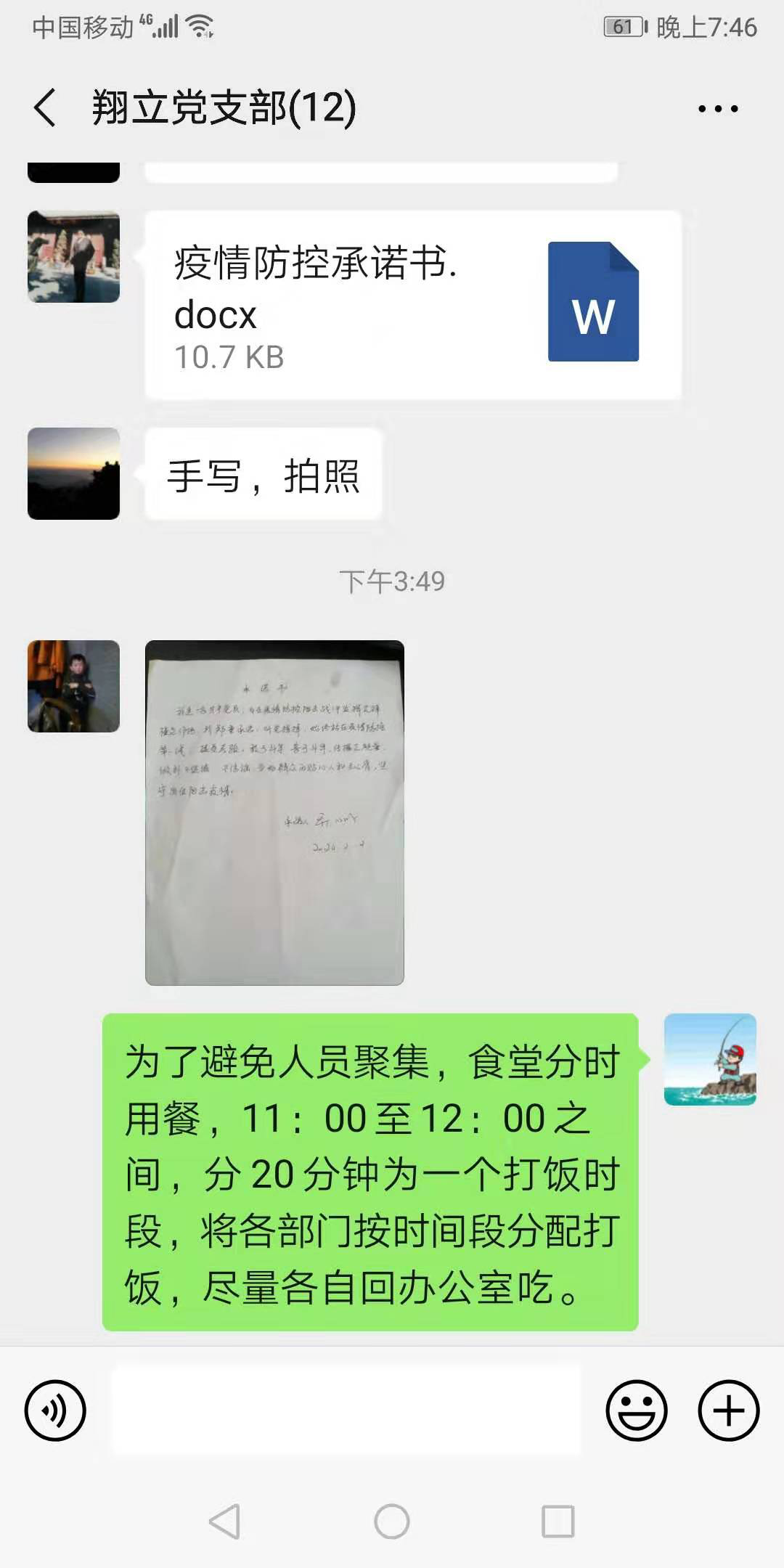 开展疫情防控建言献策活动。根据公司要求,翔立支部利用支部微信群,QQ办公群等媒体工具,组织开展了“疫情防控我承诺”,根据疫情防控要求全体管理人员和党员同志们签下承诺书。根据各岗位特点全员开展“我为疫情防控出份力”活动,号召大家出谋划策,畅所欲言将好的做法,合理的建议等进行讨论,使大家积极参与到“我为疫情防控献一策”等活动中。