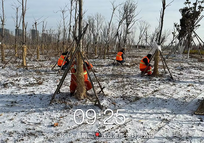 同时,各班组还对新植树木、不耐寒树木进行草绳裹干,确保树木安全越冬。在树木刷白裹干前刮去树皮上的粗翘皮和苔藓等寄生物,清理树皮缝,堵塞老树洞,进一步提高园林树木冬季防寒工作质量。