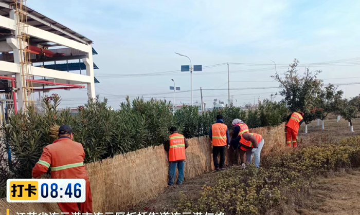 风障防寒加速进行。该分公司采购草帘500余个,对金港路、泰和路夹竹桃等不耐寒绿植精心呵护。确保低温植株不被冻伤,不出现大面积冻害现象。目前已围草帘300余个。