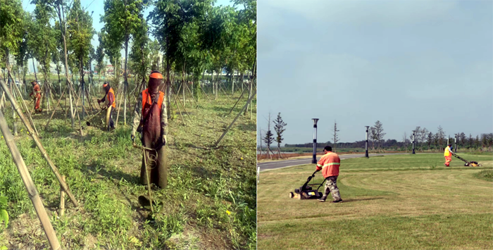 早上6:30,班组兵分三路。班长田恒亮带领一组工人用草坪机修理草坪;协管员葛成东带另一组工人用割灌机清除杂草;对于不便用机器清除的区域,第三组工作人员采取用手拔除方法,确保各区域杂草清理不留死角。