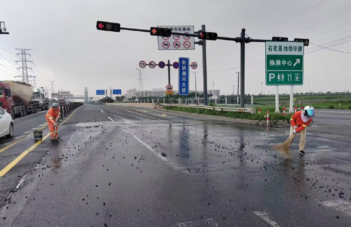 7月27日上午,临近下班之时,该分公司228省道班长姚功,接到公司应急处理电话,疏港大道向西路面近1500多米长,车辆抛洒严重影响往来车辆安全经过。正在下班的途中他二话没说,调转车头奔赴事发地点疏港大道,迅速摆开安全锥,挥动手中铁铣开始突击清理路面上矿土,石块。闻讯得知此事,共产党员纪树好,胡可贵,班组成员孙洪召等同志二话没说,一并赶往现场支援,橙色工作服在阳光照耀下显得格外靓丽。工作现场,遇到大的石块他们就用手搬,小的、碎的就用铁锨和扫把清理,中午的阳光火辣辣的,他们就这样顶着烈日奋战近两个多小时,共转运矿土泥块、石子近10余车,高质高效保障了核心道路车辆安全通行。(杨波)