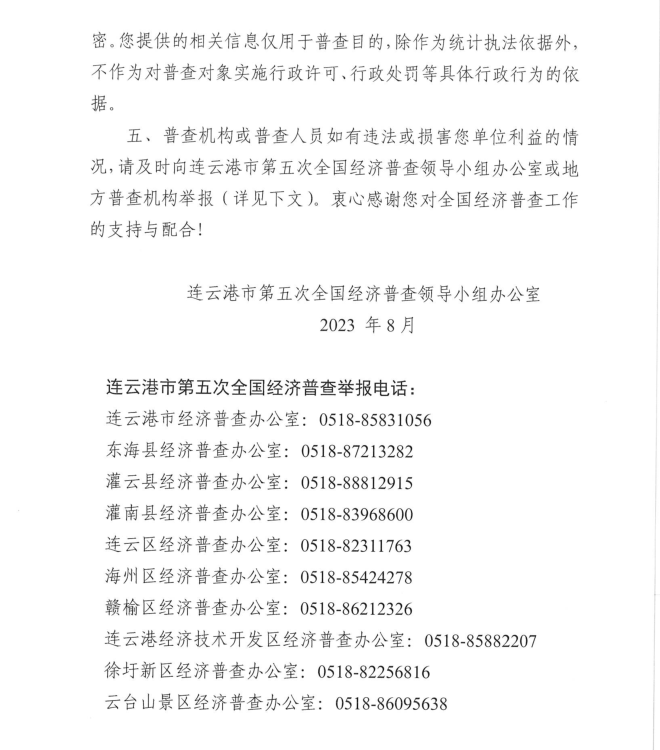 按照《全国经济普查条例》规定,国务院决定于2023年开展第五次全国经济普查,为提高经济普查质量,进一步推进普查工作顺利开展,公司按照上级第五次全国经济普查宣传动员工作要求,现将《连云港市第五次全国经济普查单位告知书》公示如下: