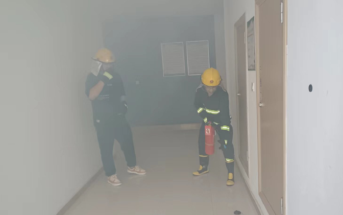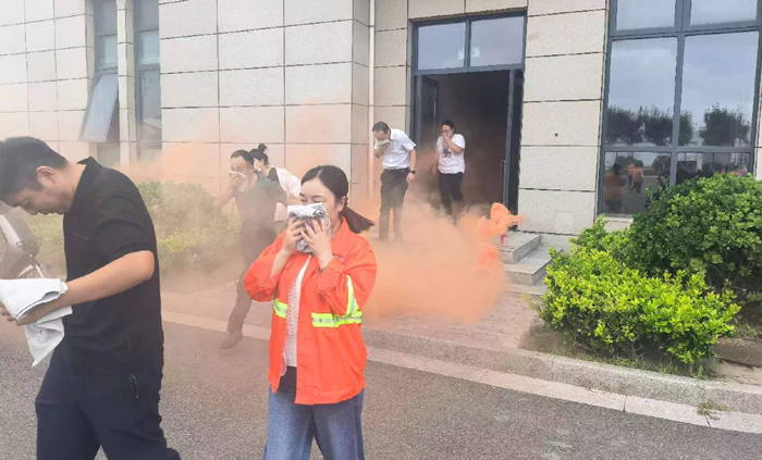 本次演练模拟公司办公楼三楼电缆井因电路故障引发火情组织职工开展应急疏散。“起火啦!”15时许,办公楼三楼一电缆井内突然涌出滚滚浓烟。临近人员发现着火后,第一时间使用灭火器进行扑救。浓烟触发自动报警装置,消防控制室值班人员接到警报后,立即通知志愿消防队伍赶赴现场扑救,并拨打报警电话,向应急指挥部报告。公司应急指挥部立即启动应急预案,灭火抢救组、安全救护组、紧急疏散组等应急小组随即到位,有条不紊开展灭火、疏散等工作。消防救援队伍到达现场后,接过现场指挥权,开展灭火救援。安全抢救组搜索受伤人员,并对受伤人员简单急救后送往医院进行治疗,紧急疏散组立即组织办公大楼人员,用湿毛巾捂住口鼻从应急通道撤离。10分钟后,险情排除,应急救援结束。最后,组织部分人员开展灭火实操演练